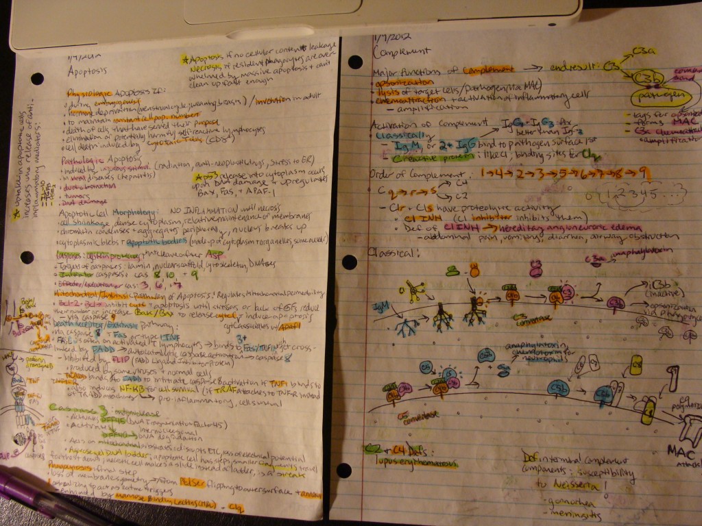 It seems as though a large portion of students who preform well on exams in medical use the same method I do. We sit down with a lecture we’ve attended, and we make an outline with pictures and decorated with many different colored highlighters. By the time two or three weeks have passed and it’s time for an exam, we have a stack of colorful, artistic (ok not artistic in my case) outlines we can review rather than flip through 75-slide powerpoint presentations. Here is an example of two of my favorite outlines from my last exam, which was today: